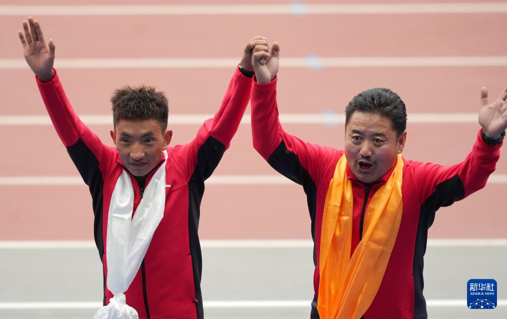2021年9月23日,西藏隊選手多布杰(左)在第十四屆全運會田徑項目上,以13分49秒16的成績奪得男子5000米冠軍。圖為他和教練員在頒獎儀式上。新華社記者 李一博 攝