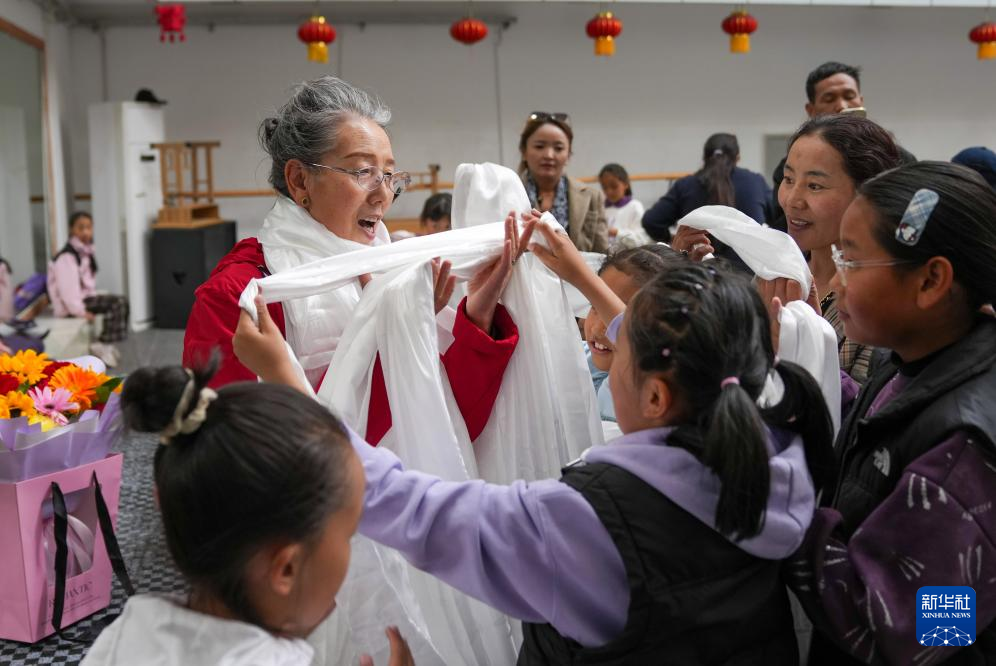 周末的西藏自治區(qū)群藝館藏戲少兒班里,巴桑奶奶在教授孩子們藏戲唱腔和身段。因?yàn)榕d趣班是周末上課,錯(cuò)過了教師節(jié),孩子們?yōu)榘蜕D棠虦?zhǔn)備了鮮花和哈達(dá),送上遲到的節(jié)日祝福。