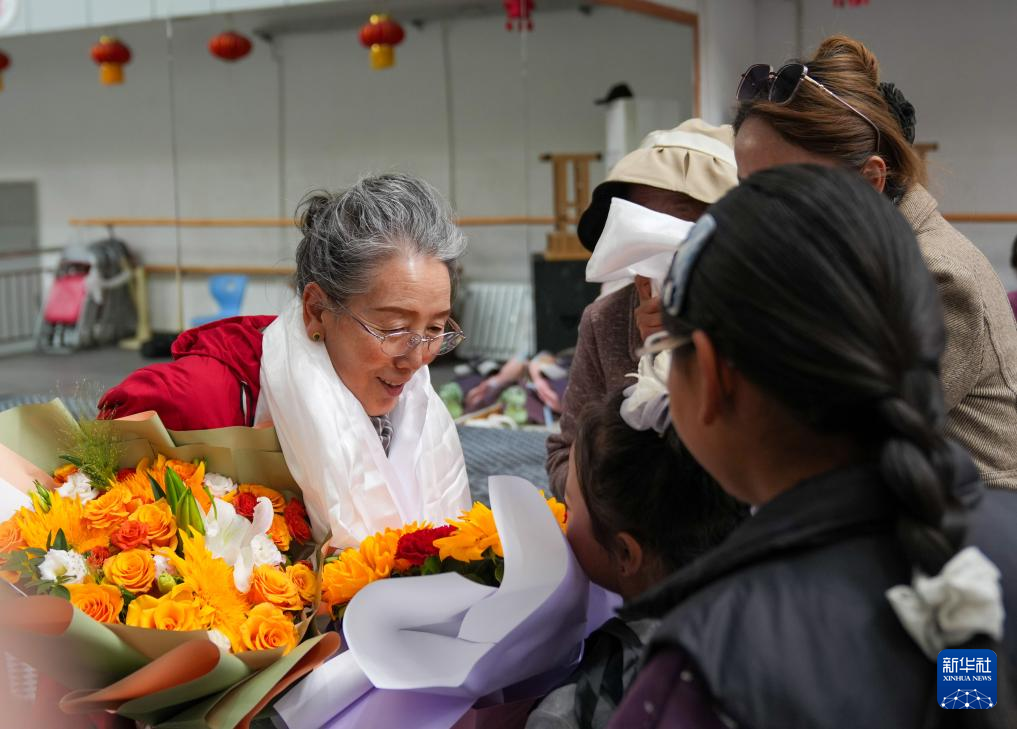 9月14日,學(xué)藏戲的孩子們?cè)诮o巴桑老師獻(xiàn)花,送上遲到的教師節(jié)祝福。新華社記者 晉美多吉 攝