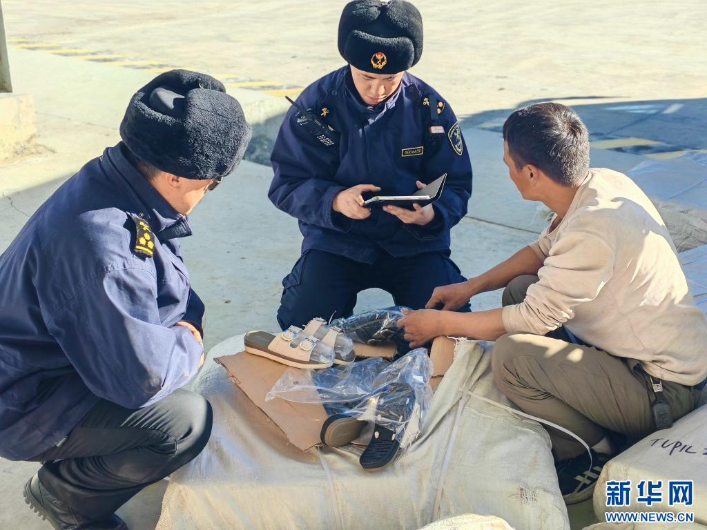 23日,拉薩海關(guān)所屬日喀則海關(guān)關(guān)員在里孜口岸查驗(yàn)出口貨物。(拉薩海關(guān)供圖)