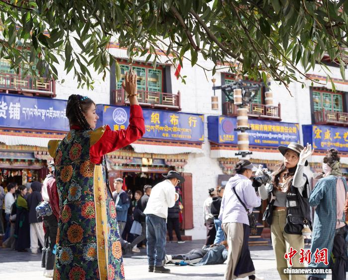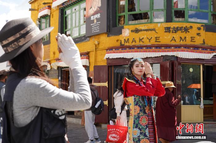 圖為來自墨西哥的游客身著藏裝在大昭寺廣場(chǎng)拍照留念。中新社記者 貢嘎來松 攝