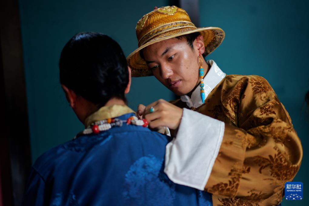 班珠丹塔為模特調(diào)整藏裝配飾(9月9日攝)。新華社記者 張笑宇 攝?