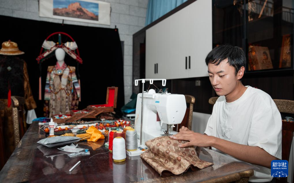 班珠丹塔在家中工作室內(nèi)縫制藏裝(9月11日攝)。新華社記者 丁增尼達 攝?