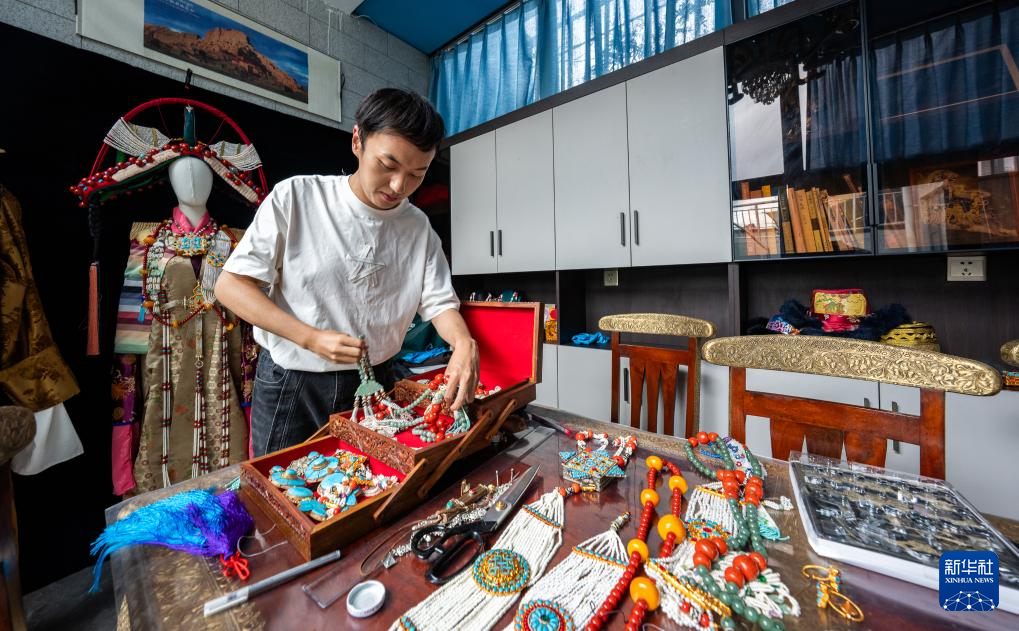 班珠丹塔在家中工作室內(nèi)整理自己做的藏式配件(9月11日攝)。新華社記者 丁增尼達 攝?