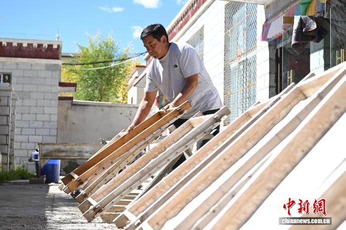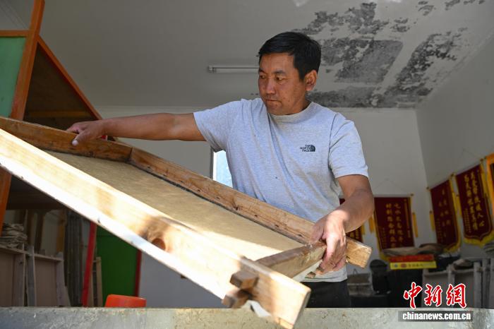 圖為尼木雪拉藏紙農(nóng)牧民專(zhuān)業(yè)合作社負(fù)責(zé)人格桑旦增在檢查藏紙的質(zhì)量。中新社記者 貢嘎來(lái)松 攝