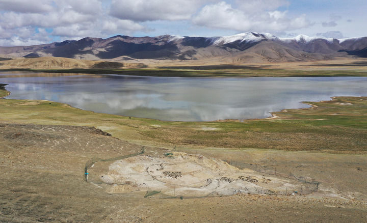 這是2025年5月22日拍攝的坐落在瑪不錯(cuò)湖畔的遺址第四期石構(gòu)地面建筑考古發(fā)掘現(xiàn)場(chǎng)(無人機(jī)照片)。新華社記者 李賀 攝