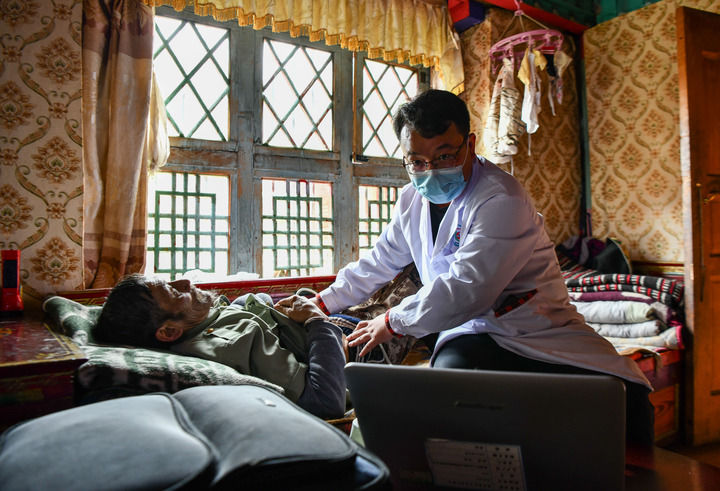 2023年6月12日,廣東珠海市人民醫(yī)院第七批援藏醫(yī)療隊(duì)王旭彤醫(yī)生在給西藏米林市吞不絨村患者珠杰檢查身體。新華社記者 晉美多吉 攝