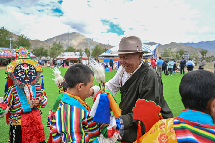 2025年7月16日,76歲的湘巴藏戲國(guó)家級(jí)非遺傳承人次仁多吉(右二)在西藏南木林縣非遺公園內(nèi)給即將表演湘巴藏戲的小演員整理服裝。新華社記者 李鑫 攝