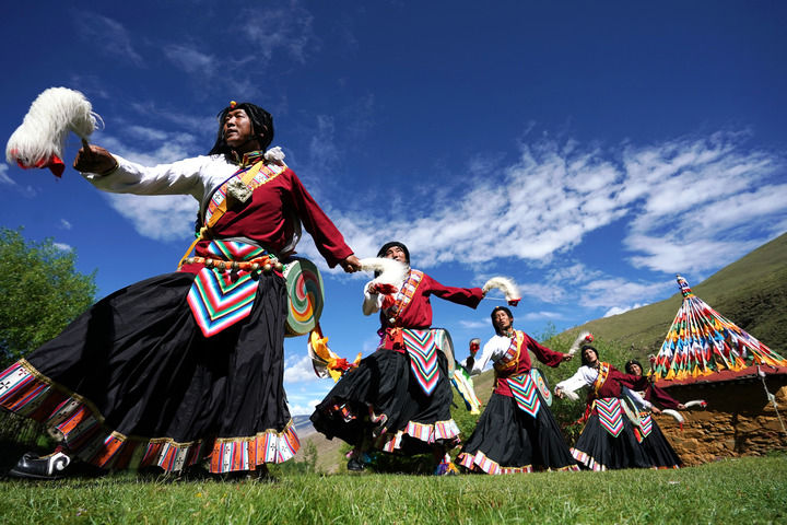 2020年7月1日,在西藏山南市瓊結(jié)縣,久河村卓舞隊(duì)的隊(duì)員在表演國(guó)家級(jí)非遺項(xiàng)目“久河卓舞”。新華社記者 詹彥 攝