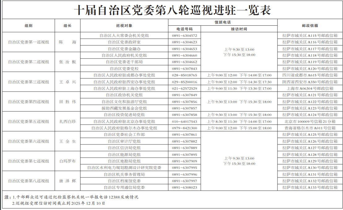 據(jù)悉,各巡視組將在被巡視單位工作50天左右,期間設(shè)專門(mén)值班電話和郵政信箱,開(kāi)通信訪意見(jiàn)箱等信訪渠道,主要受理反映被巡視黨組織領(lǐng)導(dǎo)班子及其成員、下一級(jí)黨組織主要負(fù)責(zé)人和重要崗位領(lǐng)導(dǎo)干部問(wèn)題的來(lái)信來(lái)電來(lái)訪,重點(diǎn)是關(guān)于違反政治紀(jì)律、組織紀(jì)律、廉潔紀(jì)律、群眾紀(jì)律、工作紀(jì)律、生活紀(jì)律等方面的舉報(bào)和反映。巡視組受理信訪時(shí)間截止到2025年12月10日。