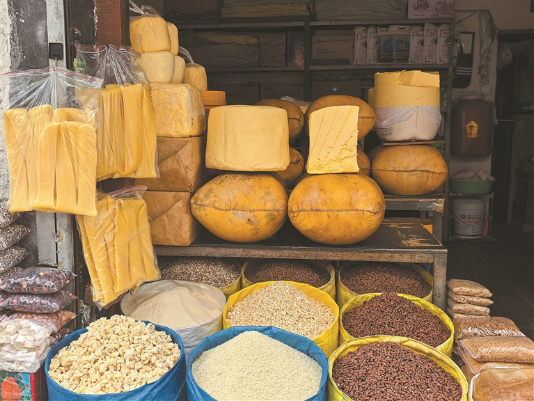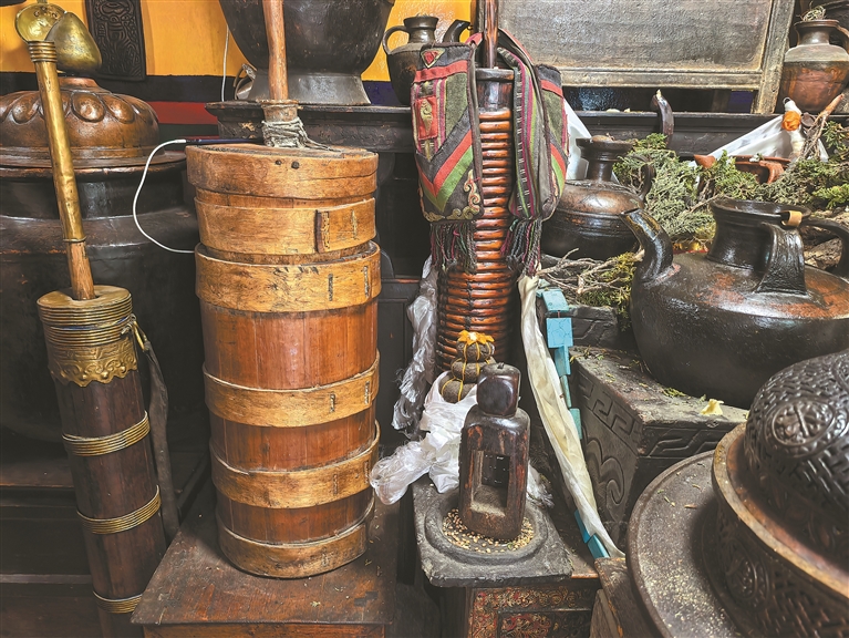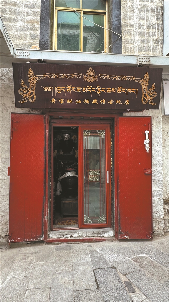 在八廓街,記者看到一家名為“奇寶酥油桶藏傳古玩店”的店鋪,店內(nèi)空間不大,卻擺放著滿滿當當?shù)摹皩氊悺薄魇礁鳂拥膫鹘y(tǒng)酥油桶、老式酥油茶壺、老式酸奶桶……像一座小小的主題博物館,展示著高原人民的勤勞與智慧。