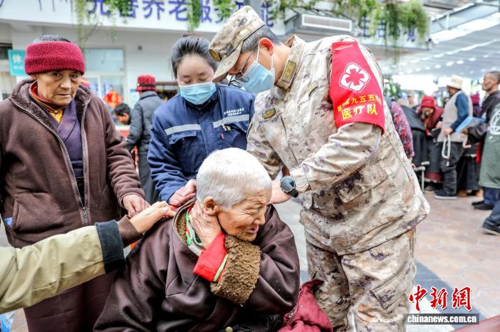 圖為醫(yī)療隊(duì)軍醫(yī)為老人檢查頸椎問(wèn)題。彭毅 供圖