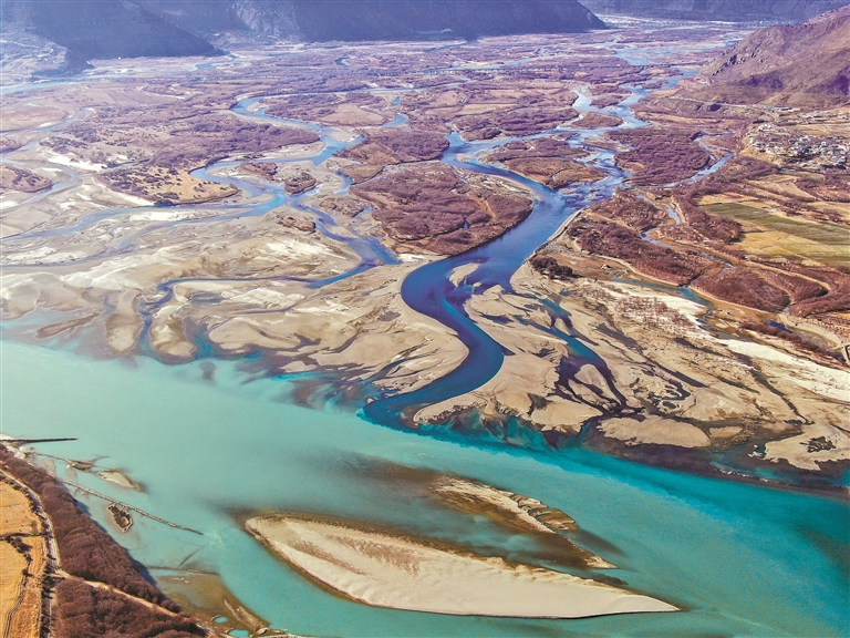 這份動(dòng)人的景致,是西藏始終堅(jiān)守生態(tài)保護(hù)的成果。冬季,雅魯藏布江流域降水減少,流速減緩,水體含沙量大幅降低,河床泥沙沉淀,水體澄澈度達(dá)到全年最高,加之礦物質(zhì)與水體交融,高原純凈的空氣讓陽(yáng)光穿透性更強(qiáng),江水的色彩層次被放大,造就了這幅江水為墨、沙洲為紙的自然畫卷。