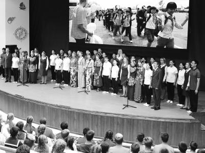 9月12日,曾經(jīng)在“海洋”全俄兒童中心療養(yǎng)的四川地震災(zāi)區(qū)學(xué)生代表和中心教職工合唱《感恩的心》。新華社發(fā)
