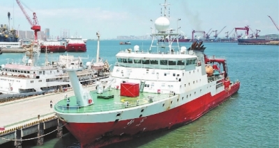 堅持和發(fā)展中國特色社會主義,實現中華民族偉大復興,必須堅定不移貫徹科教興國戰(zhàn)略和創(chuàng)新驅動發(fā)展戰(zhàn)略,堅定不移走科技強國之路。圖為靠泊在山東青島母港的“科學”號準備解纜起航。