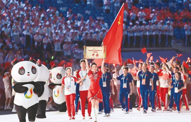 2023年7月28日,第31屆世界大學(xué)生夏季運(yùn)動(dòng)會(huì)開幕式在成都東安湖體育公園主體育場(chǎng)舉行。圖為中國大學(xué)生體育代表團(tuán)在開幕式上入場(chǎng)。 新華社記者 王曦/攝