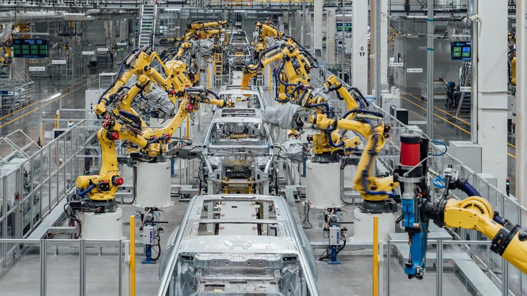 2024年2月26日在重慶市兩江新區(qū)拍攝的賽力斯汽車超級工廠焊裝車間生產線(無人機照片)。新華社發(fā)