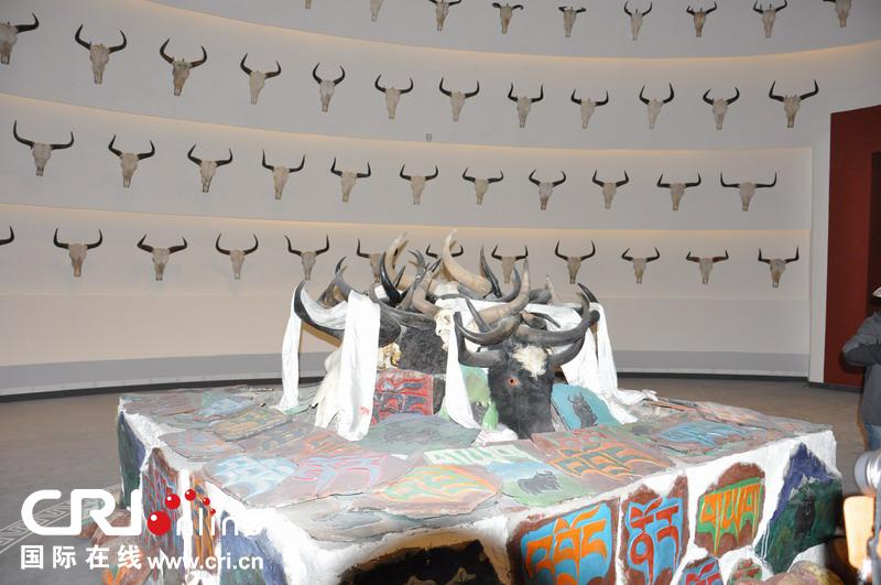 西藏牦牛博物館一共分四個廳:感恩牦牛、探秘牦牛、相伴牦牛、靈美牦牛。十世班禪大師生前說過:“沒有牦牛就沒有藏族”,深刻地揭示了牦牛與藏族密不可分的關(guān)系。感恩牦牛展廳運(yùn)用轉(zhuǎn)經(jīng)筒、牦牛頭骨、瑪尼堆、場景畫、壁畫等形式,表達(dá)了藏族人民對牦牛的感恩和崇敬。圖為感恩牦牛展廳中的展品--自然死亡的野牦牛頭部。圖片來源:國際在線