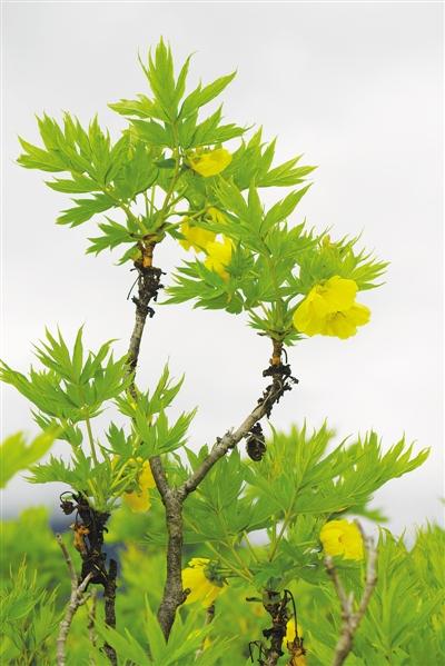株高一兩米的大花黃牡丹掩映在一片片野生灌木叢中,一點點吸收陽光雨露再綻放出花朵。在片片綠葉的“呵護”下,大花黃牡丹有的嬌羞待放,有的則花瓣重重疊疊,在陽光下傲然吐露花蕊。