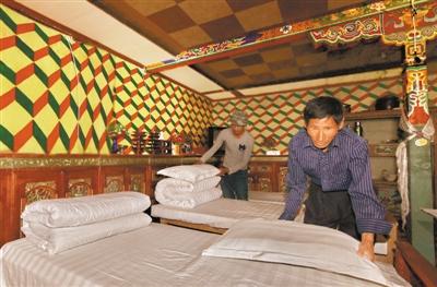 圖為阿里地區(qū)札達縣托林鎮(zhèn)群眾正在自己的家庭旅館中收拾床鋪。次旺 唐斌 攝