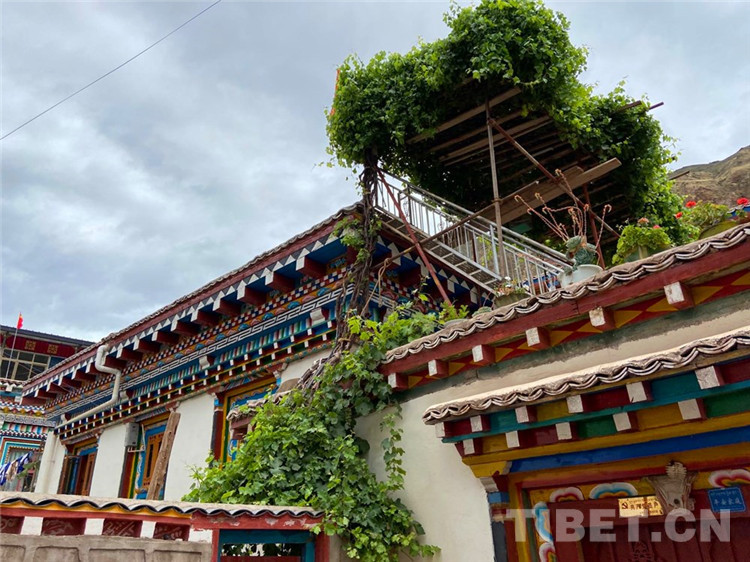與同行者贊嘆一番,我的目光緩緩下移。在葡萄架側(cè)下方的房頂上,擺放著一排花盆。眾人皆知藏族愛花,即使在冬季,居民也會在陽臺養(yǎng)著幾盆花。如今進入雨季,主人把一盆盆花兒搬上房頂,與遠(yuǎn)方的朋友共享好時光。