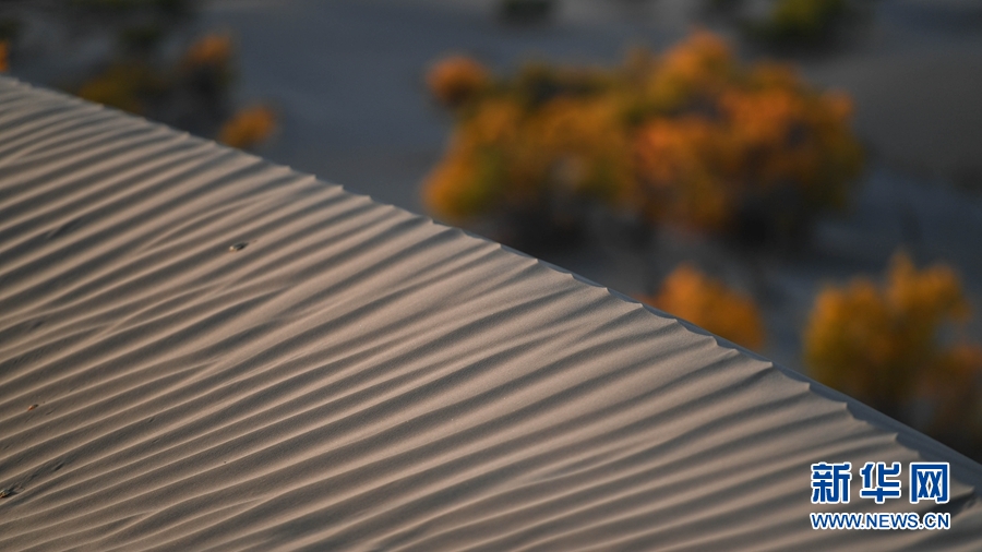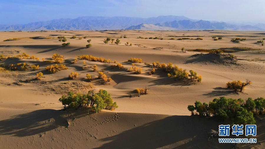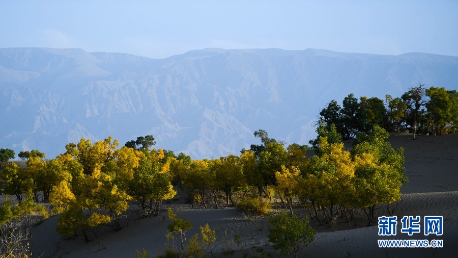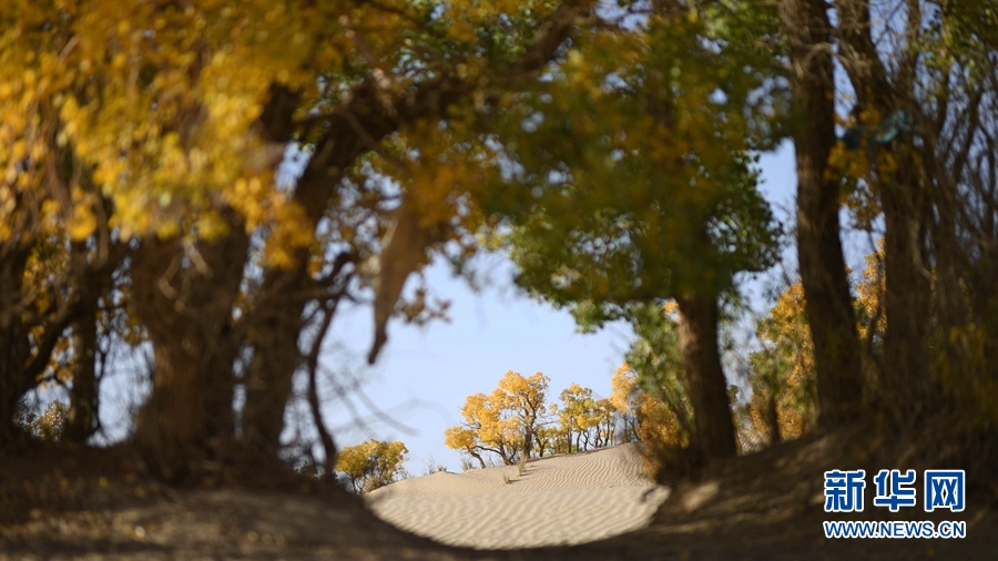 披上了金黃色外衣的胡楊林,成為沙漠里的一抹亮色。新華網 潘彬彬攝