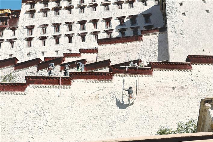 世界文化遺產(chǎn)布達(dá)拉宮10月26日起迎來了一年一度的粉刷季,工作人員將用10余天的時(shí)間對(duì)宮墻、白塔、窗框進(jìn)行整體粉刷,為布達(dá)拉宮美顏。圖為10月28日,施工人員給布達(dá)拉宮墻體噴灑涂料。記者 李洲 洛桑 攝