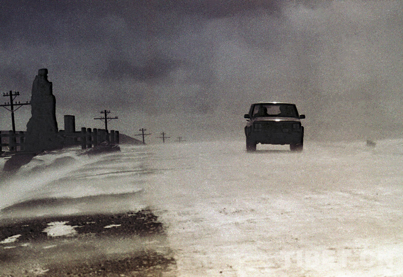 這是一輛汽車正在通過風(fēng)雪彌漫的青藏公路最高處唐古拉山口(唐召明1991年冬攝)