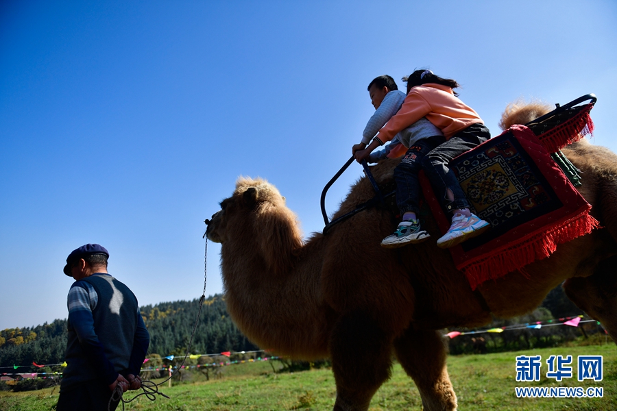 游客在青海省西寧市湟中區(qū)攔隆口鎮(zhèn)卡陽(yáng)村景區(qū)內(nèi)體驗(yàn)騎駱駝。新華社記者 張龍 攝