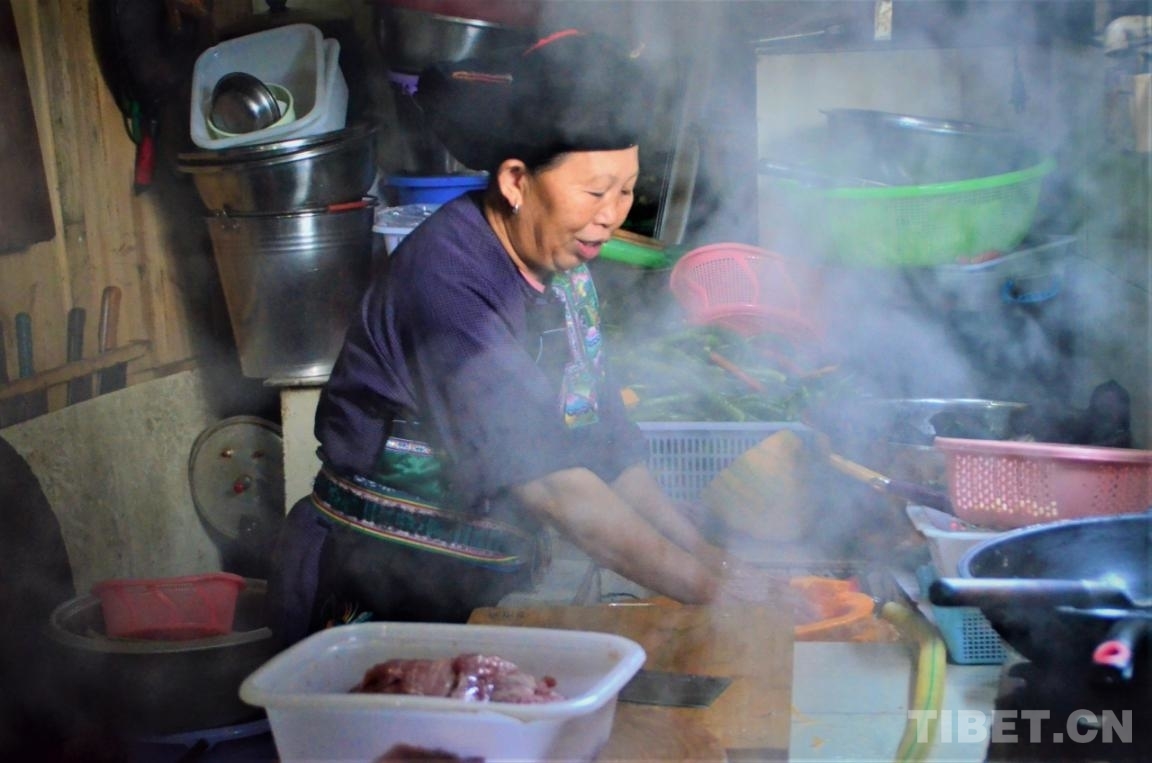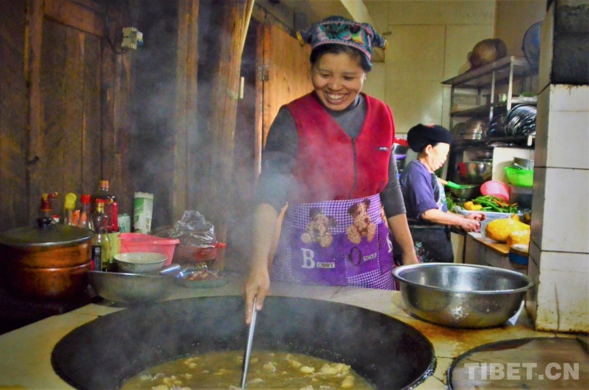 中國西藏網(wǎng)訊 上午十點(diǎn)多,差不多到了楊珍壽一天之中最忙碌的時候。她有條不紊地翻炒著大鐵鍋里的雞肉,母親在她身后切著菜,父親在劈著柴火。再過一個小時左右,自家的農(nóng)家樂就要開飯了。每到周末,更多游客會來到這里,忙碌翻倍,收入也會翻倍。