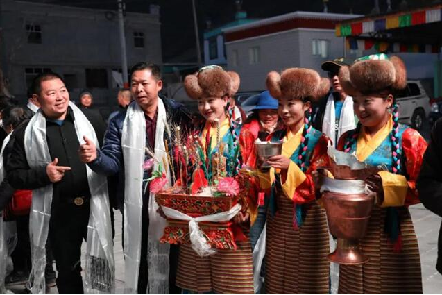 首發(fā)團(tuán)一到達(dá)歡迎儀式現(xiàn)場,藏族同胞便端出裝滿糌粑、寓意圓滿如意的切瑪盒迎接游客,大家一起為游客獻(xiàn)上潔白的哈達(dá),并送上真摯的祝?!霸鞯吕铡薄T餮┌筒貞蛱饋?,青稞酒喝起來,山南人民的熱情好客讓現(xiàn)場所有游客驚喜連連,感受到了滿滿儀式感。