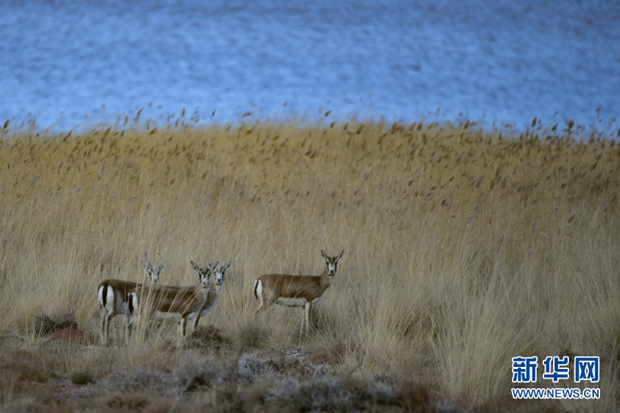四只鵝喉羚在都蘭湖國家濕地公園內(nèi)活動(dòng)。(11月21日攝)新華網(wǎng) 潘彬彬攝