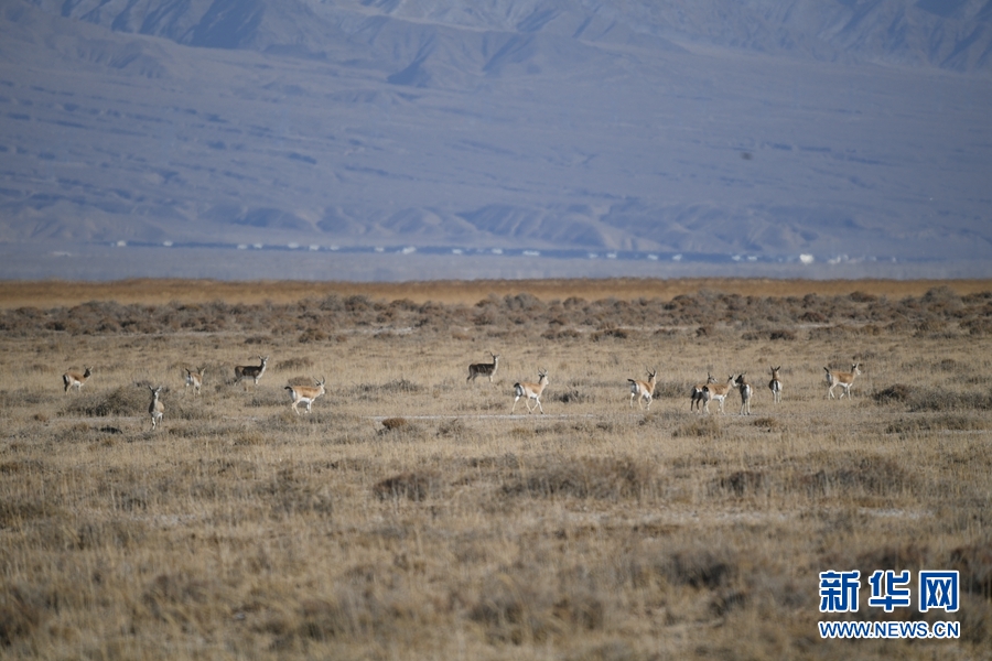 一群鵝喉羚在都蘭湖國家濕地公園內(nèi)活動(dòng)。(11月21日攝)新華網(wǎng) 潘彬彬攝