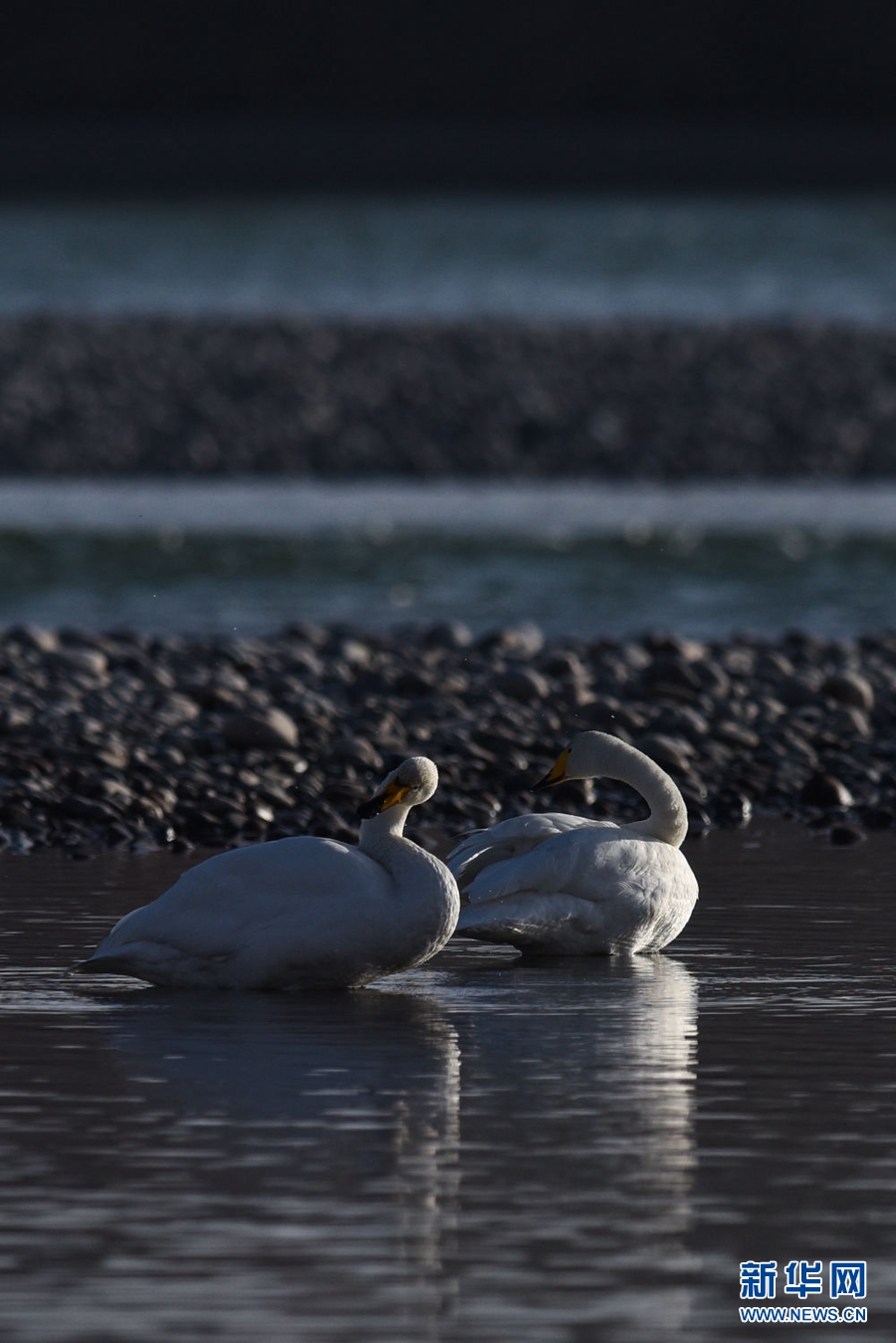 12月11日,幾只大天鵝在青海省貴德縣境內(nèi)的黃河里游弋。新華社記者 吳剛 攝