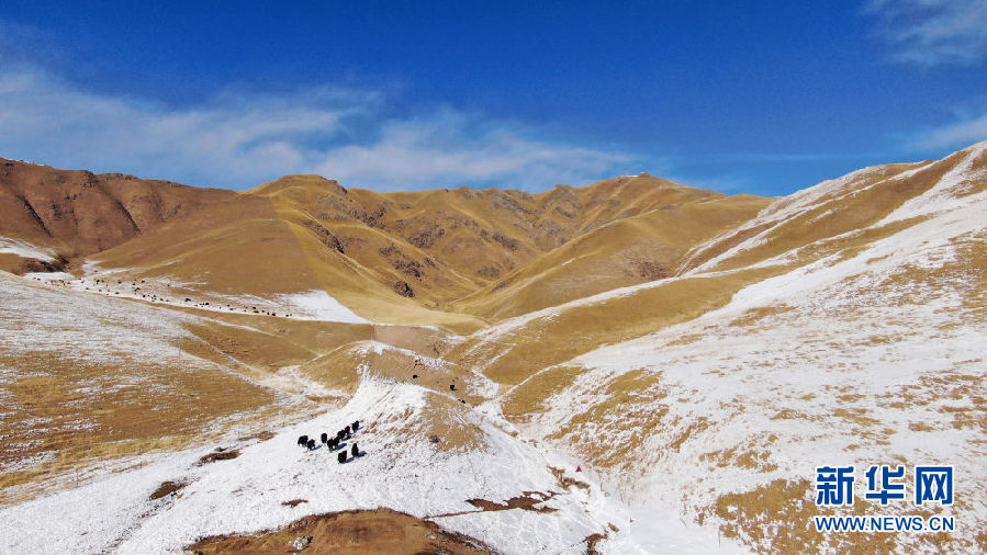 在青海省祁連縣,一群牦牛在雪后活動(dòng)(12月7日攝,無(wú)人機(jī)照片)。新華社記者 張宏祥 攝