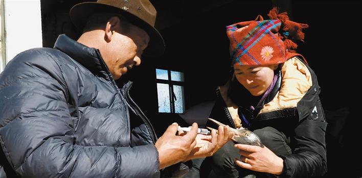 “你看,這只黑頸鶴是十幾天前我從田間救回來的,當時它的翅膀和右腿都受了傷,奄奄一息,我還擔心救不活它。我把消炎藥放入酥油中攪拌制成膏藥,涂抹在它的傷口上,并給它喂了口服消炎藥,白天就把它放到院子里,讓它鍛煉受傷的腿腳。通過細心照料它恢復得很好,等它痊愈了,我就把它放歸大自然?!?9歲的巡護員多布杰高興地說。