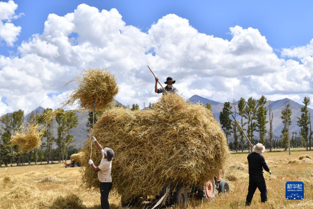 9月21日,拉薩市林周縣邊林鄉(xiāng)當(dāng)杰村的村民在收集秸稈。新華社記者 姜帆 攝