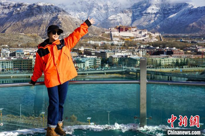 圖為游客在拉薩南山公園與布達(dá)拉宮雪景合影?!〗w波 攝
