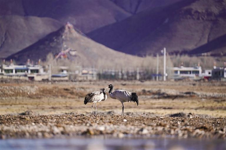 黑頸鶴是國(guó)家一級(jí)保護(hù)動(dòng)物,在藏語(yǔ)中稱(chēng)為“沖沖”。主要棲息在海拔2500米至5000米的高原、草甸、沼澤地帶。拉薩北部的林周縣平均海拔約4200米,是黑頸鶴的主要越冬地之一。最近這段時(shí)間,對(duì)拉薩市林周縣野保員們來(lái)說(shuō),一邊要忙自家的農(nóng)活,一邊還要巡查候鳥(niǎo)情況?!耙呀?jīng)有一小部分飛走了,估計(jì)再過(guò)半個(gè)月都會(huì)陸續(xù)飛走?!?月23日上午,野保員旦增告訴記者,在虎頭山水庫(kù)和卡孜水庫(kù)越冬的候鳥(niǎo)有一部分已經(jīng)飛走了。野保員口中的“飛走”便是遷徙,遷徙是候鳥(niǎo)的本能,一年一年,跟隨時(shí)間的召喚,完成兩次遷徙:繁殖和越冬。