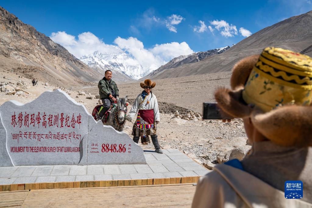 在珠峰大本營的珠峰高程測量紀(jì)念碑前,游客拍照留念(5月20日攝)。新華社記者 孫非 攝