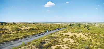 登上杭錦旗第一條穿沙公路旁的防火瞭望塔,四下遠(yuǎn)望,只見公路兩側(cè)的沙地,被沙生植物覆蓋起來(lái)。這條全長(zhǎng)115公里的黑色柏油路,從杭錦旗錫尼鎮(zhèn)出發(fā),猶如一把利劍,直插庫(kù)布其沙漠腹地,硬生生將沙漠?dāng)r腰劈斷。