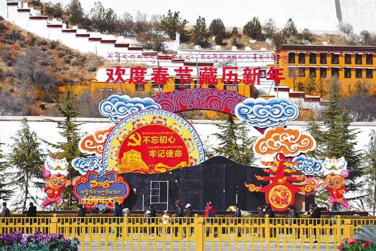 春節(jié)、藏歷新年臨近,我區(qū)各市(地)街頭巷尾處處洋溢著濃郁的節(jié)日氣氛。 圖為2月10日,布達(dá)拉宮廣場(chǎng)節(jié)日景觀花雕。 記者 李洲 攝