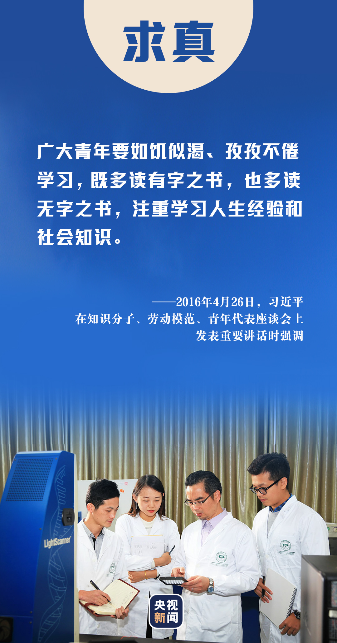2013年五四青年節(jié),習近平總書記來到中國航天科技集團公司中國空間技術研究院,與青年代表座談??倳浿赋觯瑥V大青年要堅持面向現(xiàn)代化、面向世界、面向未來,增強知識更新的緊迫感,如饑似渴學習,既扎實打牢基礎知識又及時更新知識,既刻苦鉆研理論又積極掌握技能,不斷提高與時代發(fā)展和事業(yè)要求相適應的素質和能力。