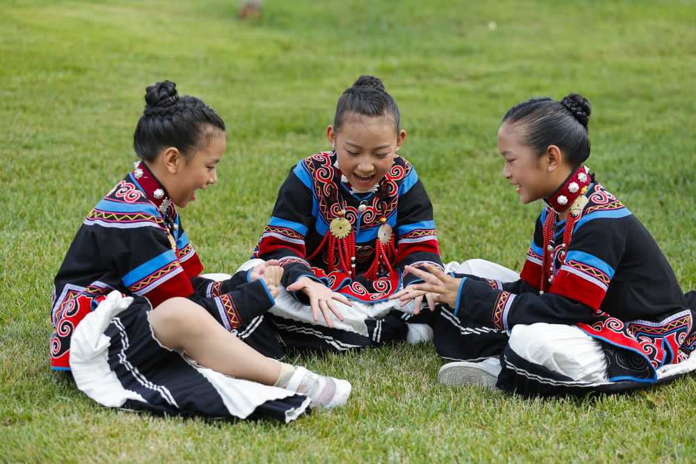 7月2日,在昭覺(jué)縣萬(wàn)達(dá)融創(chuàng)紅絲帶愛(ài)心學(xué)校參與排練的俄地惹漢(前左)、馬杰英(前中)和吉合拉作(前右)。(受訪(fǎng)者供圖)