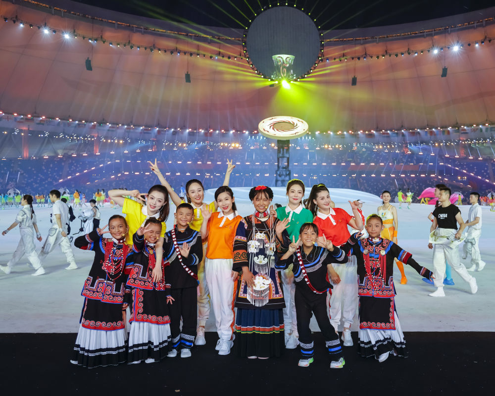 7月23日,成都大運(yùn)會(huì)開(kāi)幕式彩排結(jié)束后,一些演員主動(dòng)和來(lái)自大涼山的孩子們拍攝合影。新華社記者 沈伯韓 攝