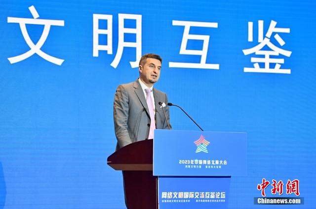 7月18日,2023年中國網(wǎng)絡(luò)文明大會網(wǎng)絡(luò)文明國際交流互鑒論壇在廈門舉辦。中外嘉賓圍繞加強(qiáng)網(wǎng)絡(luò)文明交流、互鑒、共存等話題展開探討。圖為中國—阿拉伯國家博覽會顧問委員會委員肖克作主題演講。中新社記者 王東明 攝