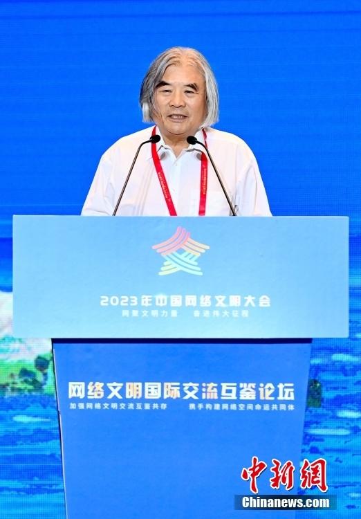 7月18日,2023年中國網(wǎng)絡(luò)文明大會網(wǎng)絡(luò)文明國際交流互鑒論壇在廈門舉辦。中外嘉賓圍繞加強(qiáng)網(wǎng)絡(luò)文明交流、互鑒、共存等話題展開探討。圖為光明日報(bào)社原副總編輯、浙大城市學(xué)院文明與傳播研究院研究員沈衛(wèi)星作主題演講。中新社記者 王東明 攝